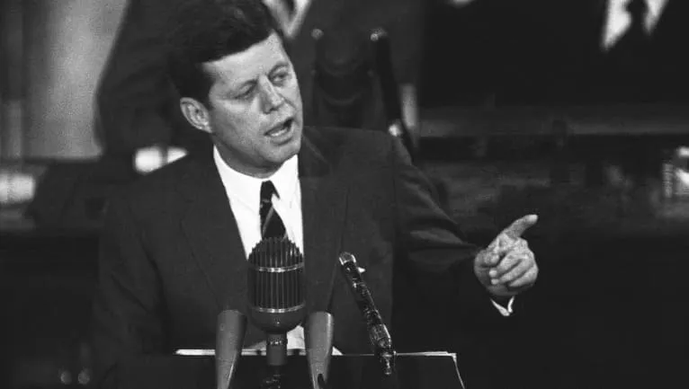What president declared the goal of landing an American on the moon?